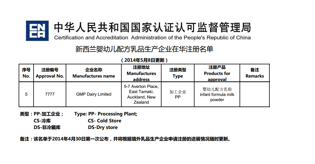 GMP Dairy Limited has been informed by the New Zealand Ministry for Primary Industries (MPI) that it is the first to be registered by the Chinese government for the export of Infant Formula products to China. According to MPI, the company did not need to take any corrective actions to meet the Chinese requirements. Based on the list of manufacturers published last night on the Chinese authorities’ website, GMP Dairy is one of the eight infant formula manufacturers who have been registered. From 1st May 2014 (today), non-registered foreign manufacturers of infant formula will not be allowed to export infant formula to China.